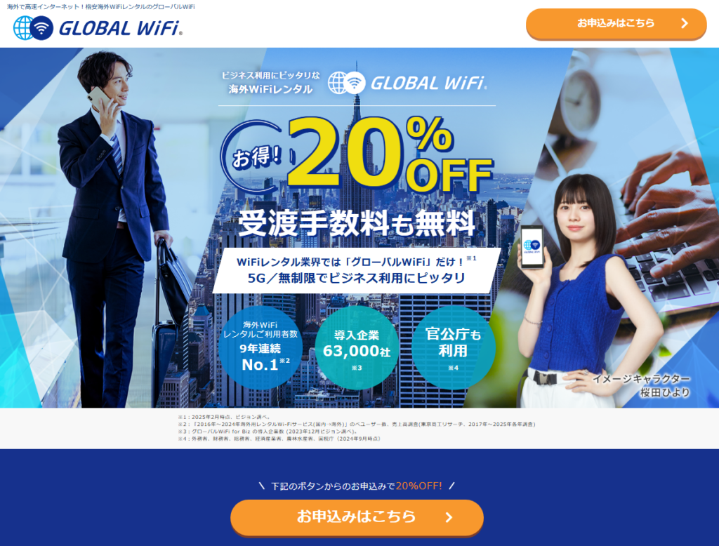 グローバルWiFiは、海外でインターネットを利用するためのWiFiレンタルサービスとして多くの利用者がいます。